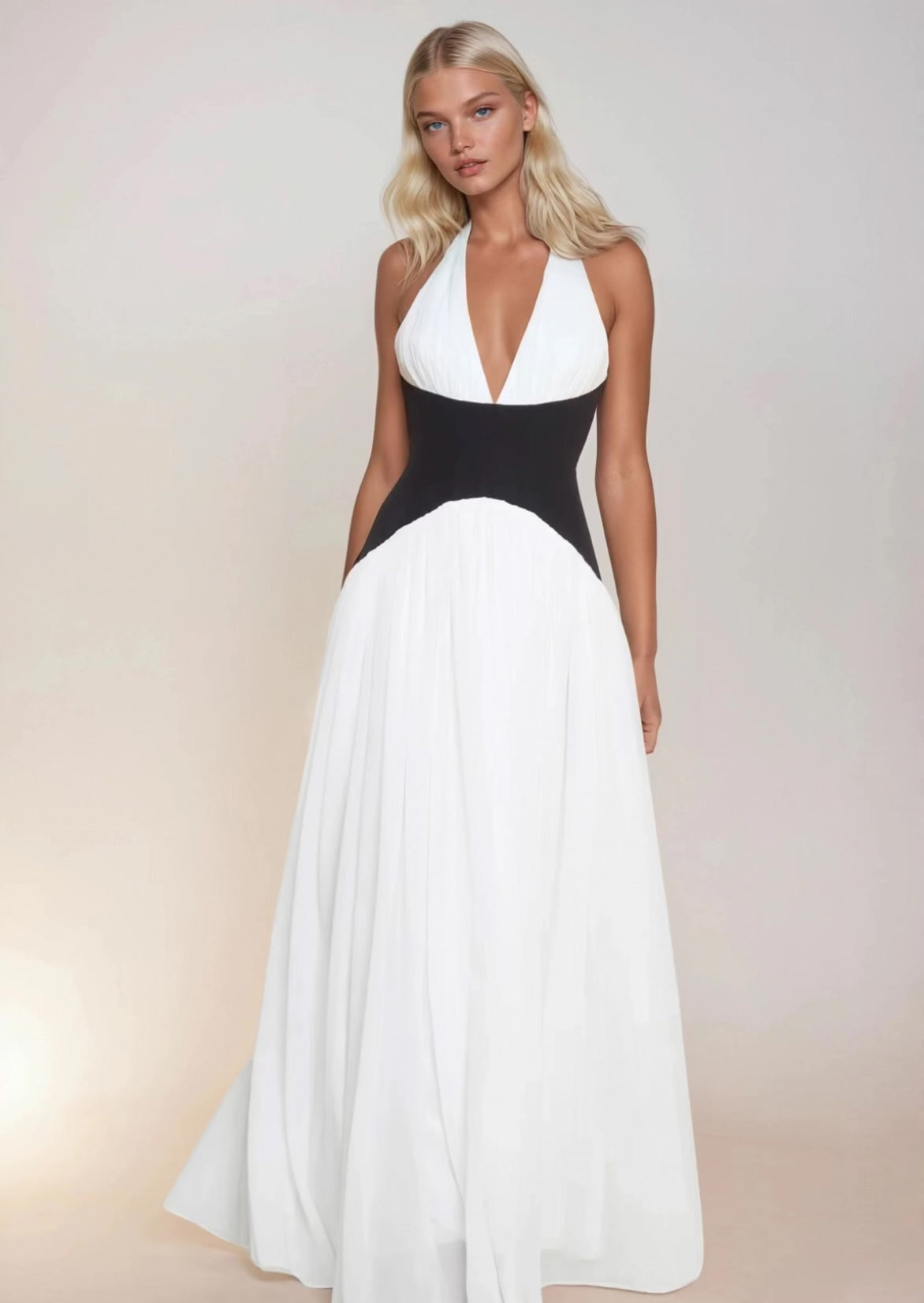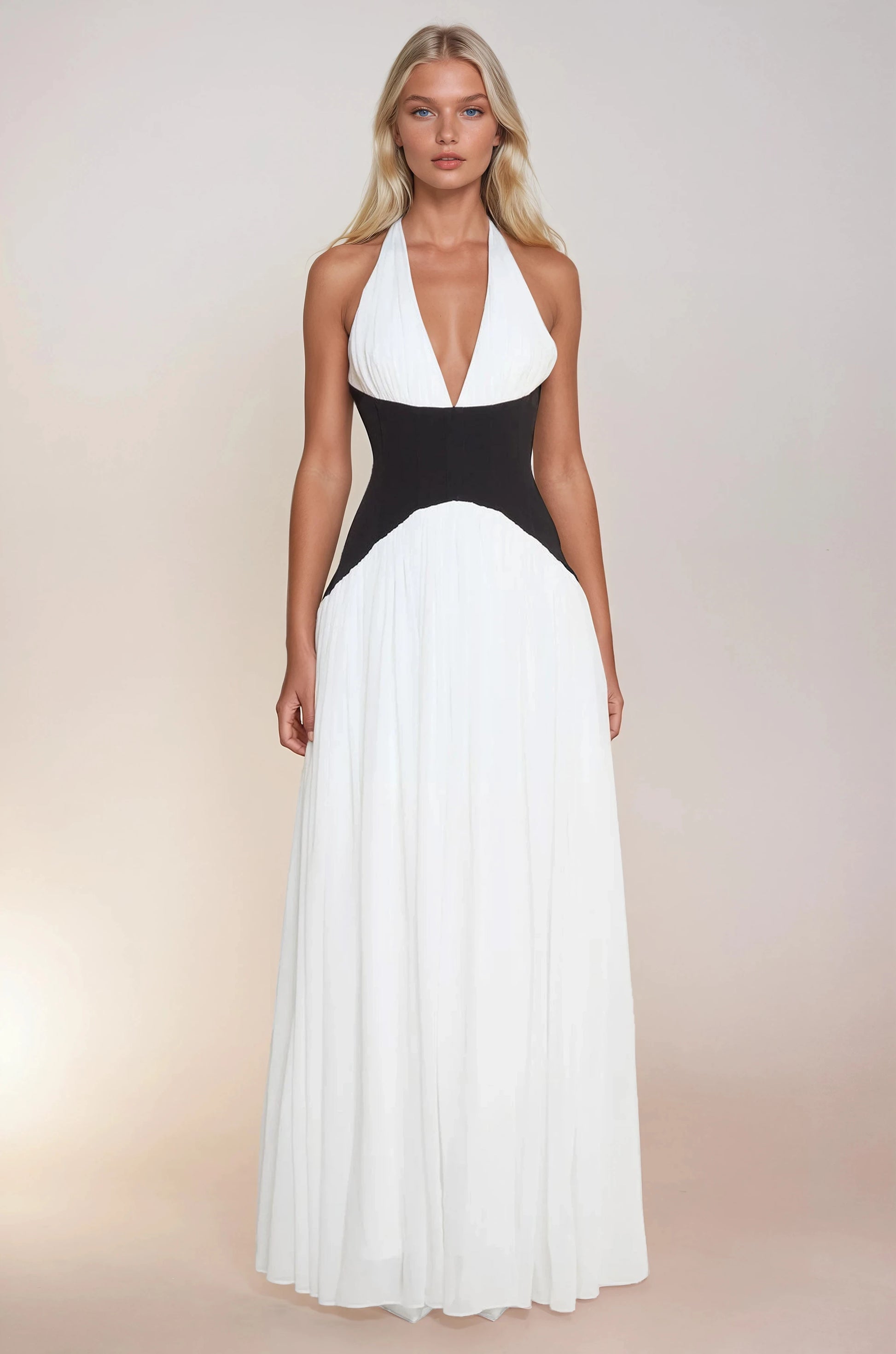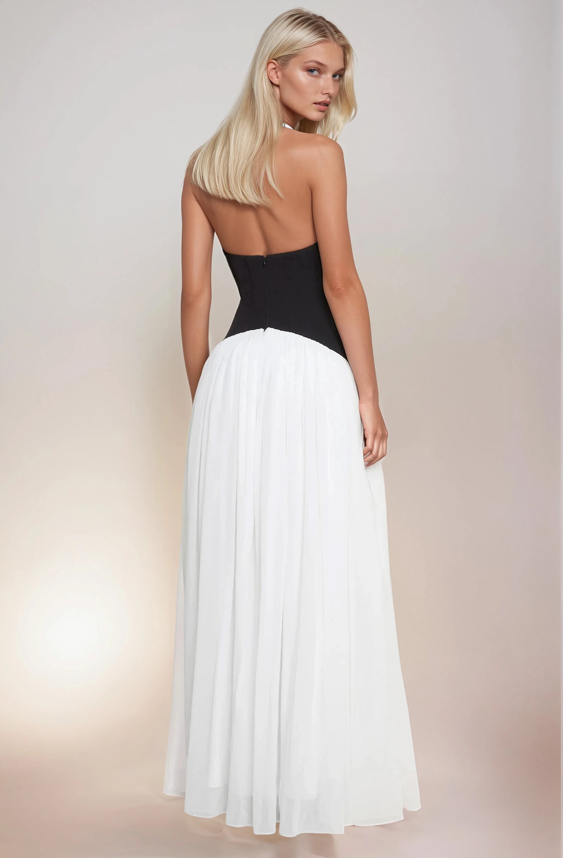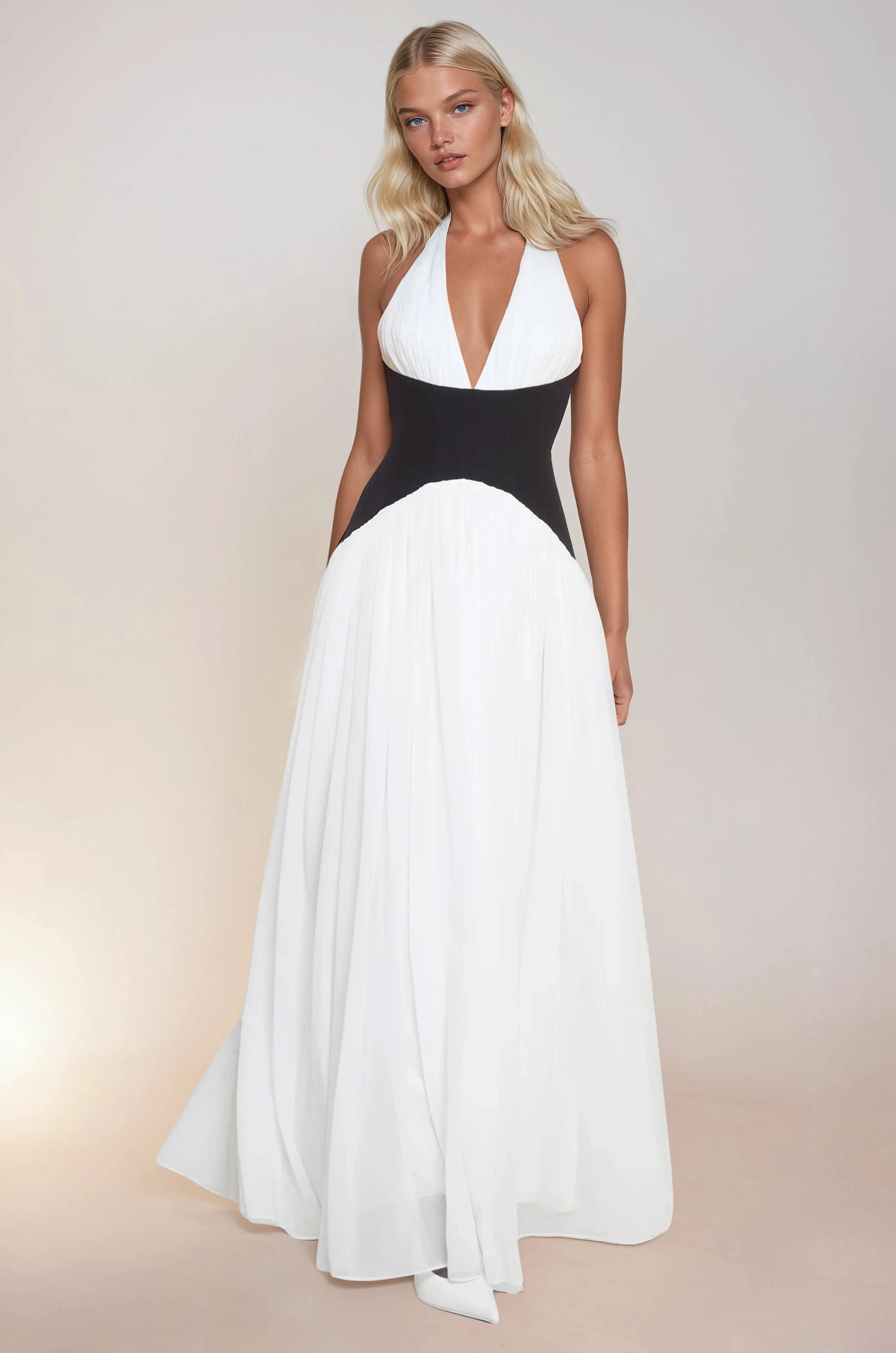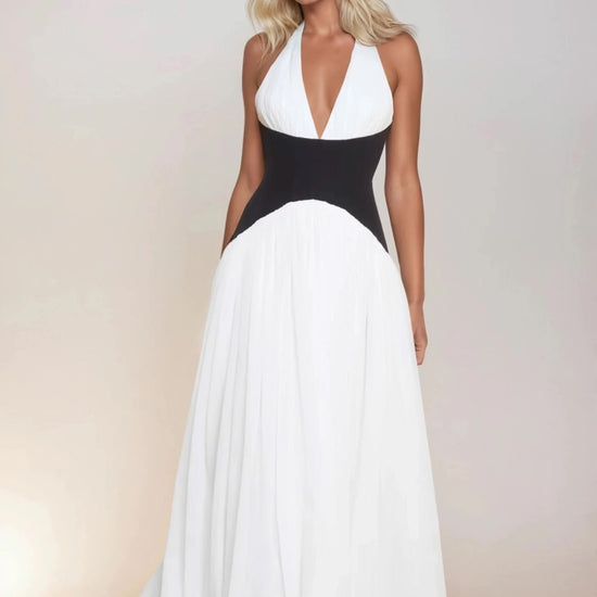 Dreamy and modern all at once; the DESTIJY Contrast Corset Maxi Dress is a timeless standout. Crafted from luxurious premium chiffon fabric, this white maxi dress is delicately gathered across the halter neckline and below the corset for an effortless effect. The structured black corset waist creates a striking contrast while sculpting and emphasizing your figure. This dress is your go-to for making an unforgettable statement.