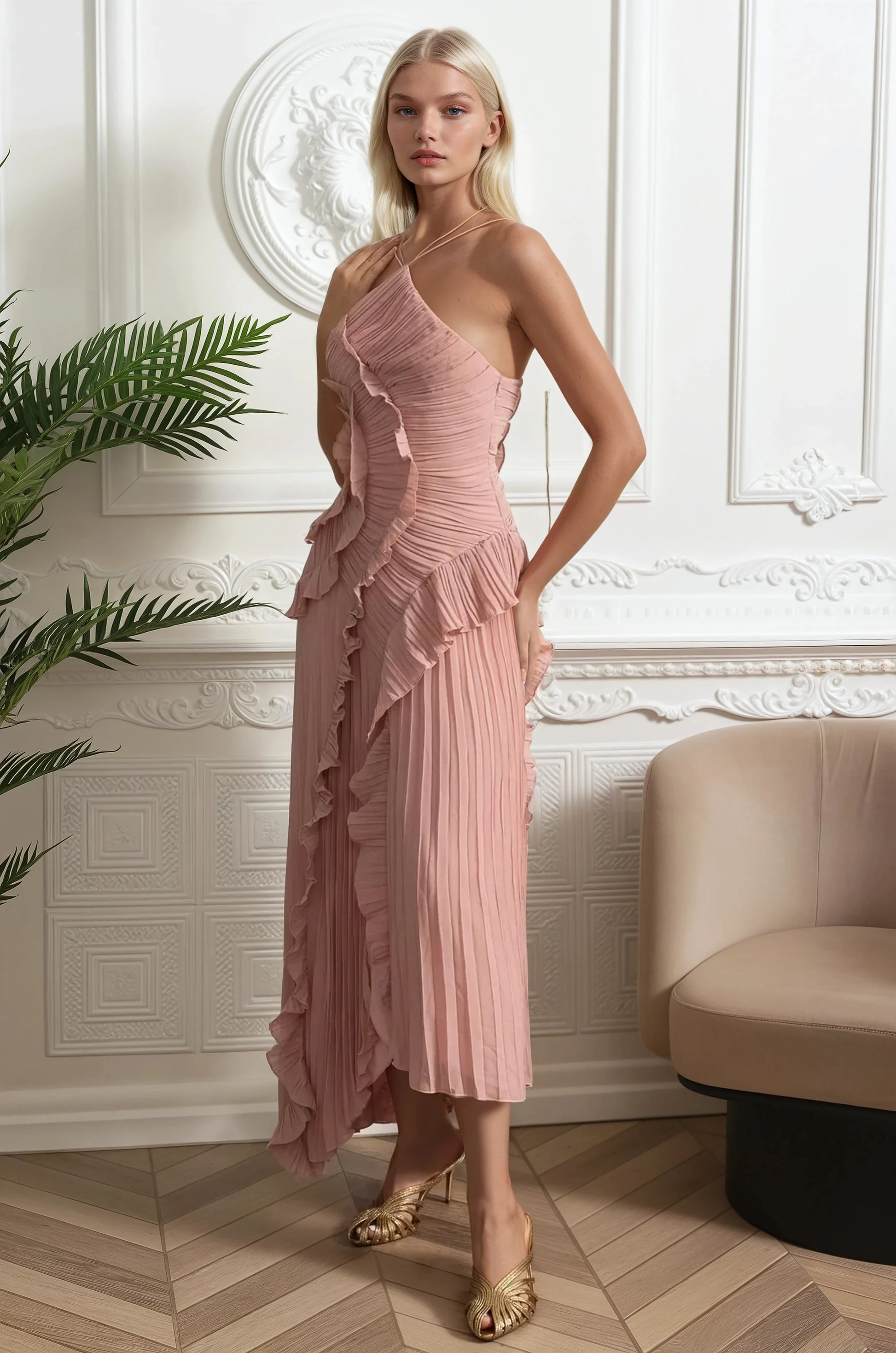 - Pink Noore Midi Dress With Cascading Ruffle Details